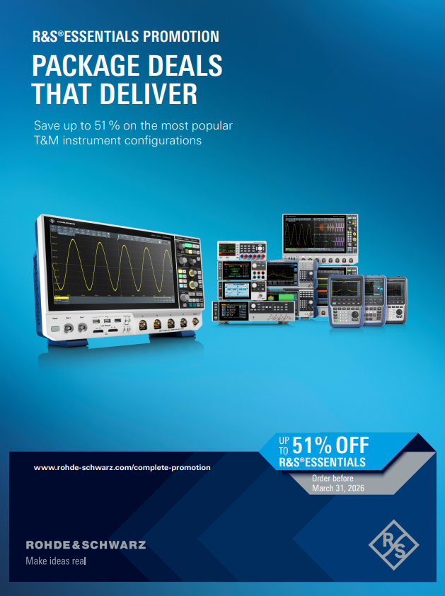 Be ready for what’s next with future-proof test equipment. Rohde & Schwarz are offering up to 51% off our most popular instruments, fully pre-configured for your testing needs and ready to deliver immediate results. You can save on the essential tools every engineer relies on, including oscilloscopes, DC power supplies, source measure units, LCR meters, spectrum and antenna analysers, and signal generators. R&S package deals are tailored to a wide range of testing requirements. Everything is preconfigured so you can get started right away. Each package comes at one clear price with no hidden upgrade fees. The result is maximum bench performance at exceptional savings.